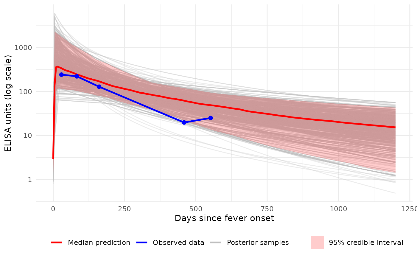 plot_predicted_curve.RdPlots a median antibody response curve with a 95% credible interval ribbon, using MCMC samples from the posterior distribution. Optionally overlays observed data, applies logarithmic spacing on the y- and x-axes, and shows all individual sampled curves.